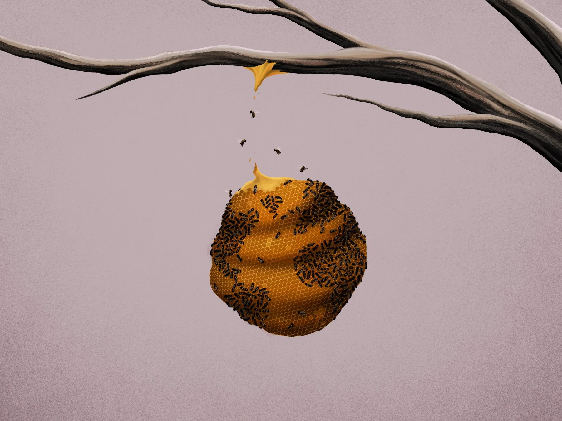 We created an illustration of a globe-shaped beehive falling from a barren tree to symbolize the ongoing larger reality we face as our climate shifts, and the pessimism reflected in the public opinion.