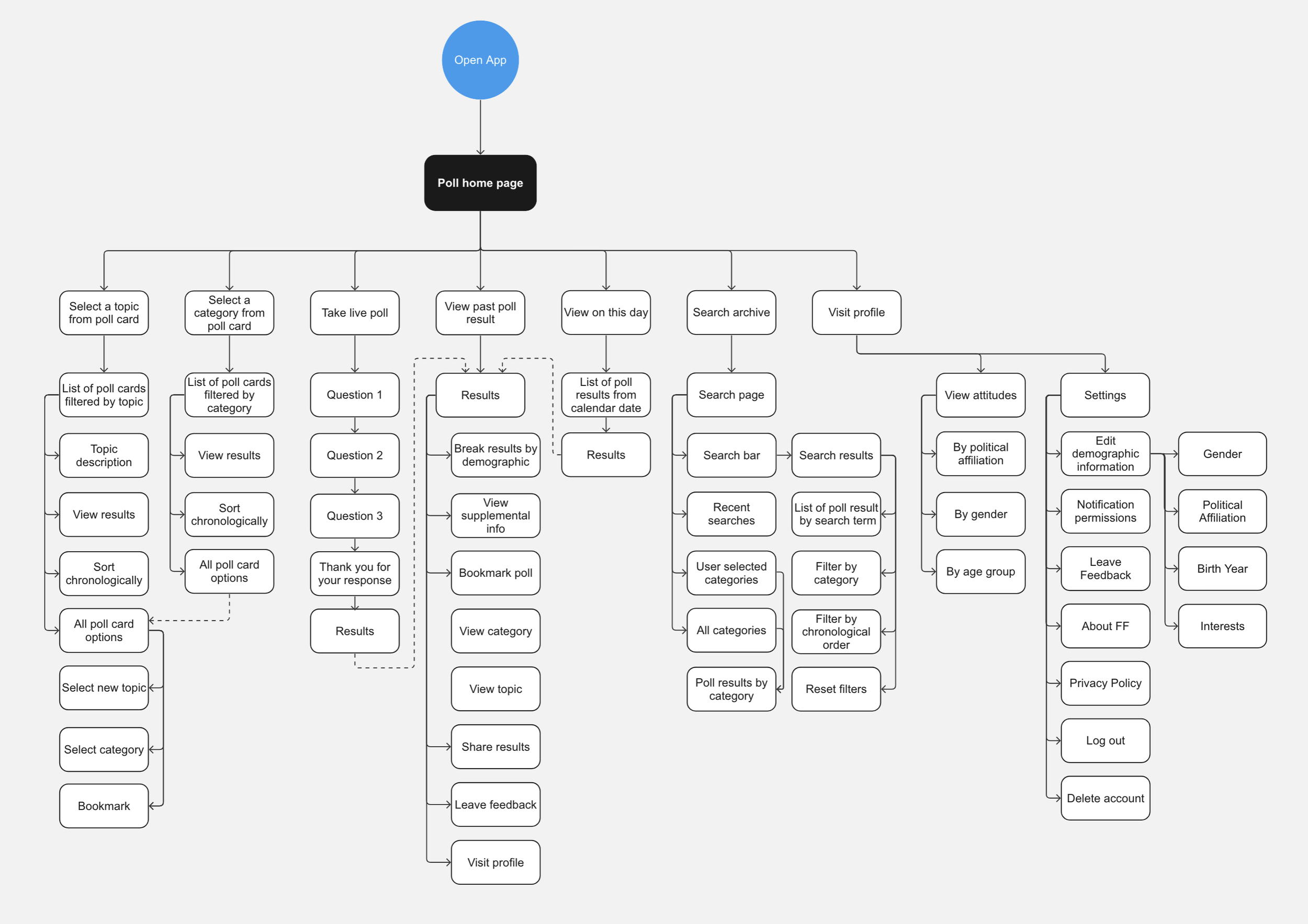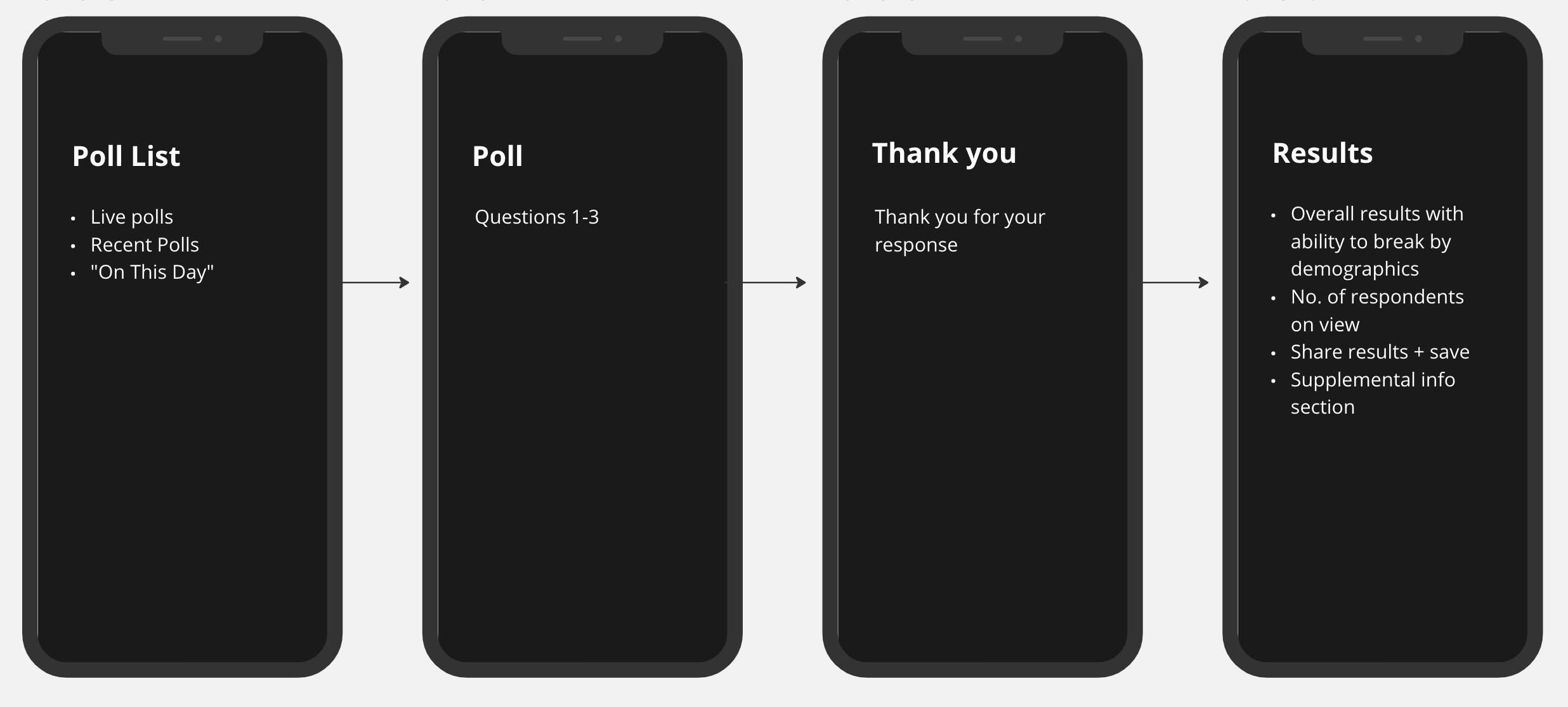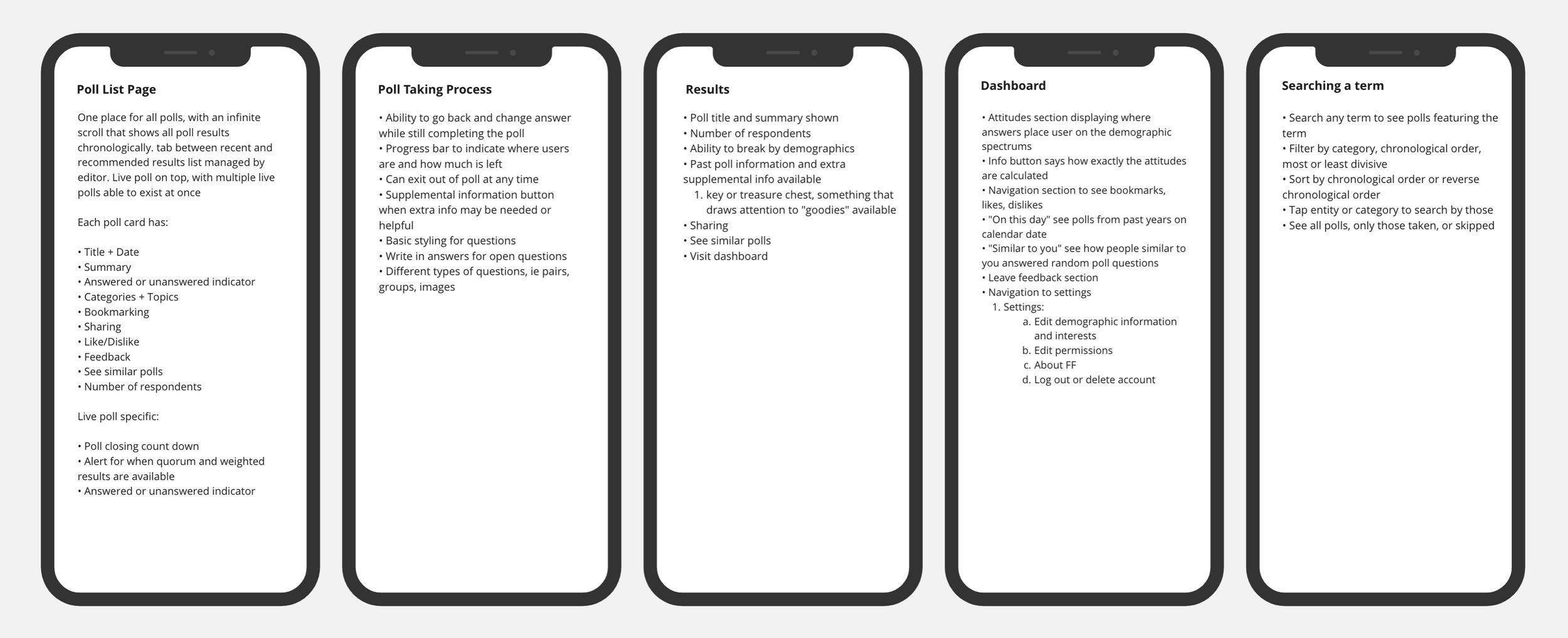 Early brainstorming for information architecture, ideas such as liking and disliking of polls and “see similar polls” are still in play.