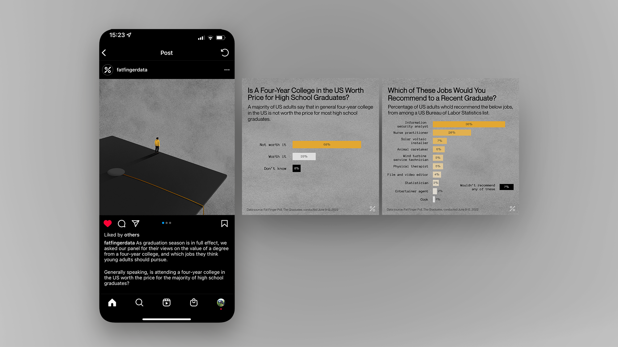 During graduation season, Fat Finger conducted a poll on what sort of future graduates may have. We used the graduation cap as a cliff with a small figure looking off, reflecting uncertainty and a leap to the unknown.